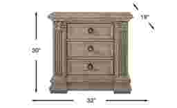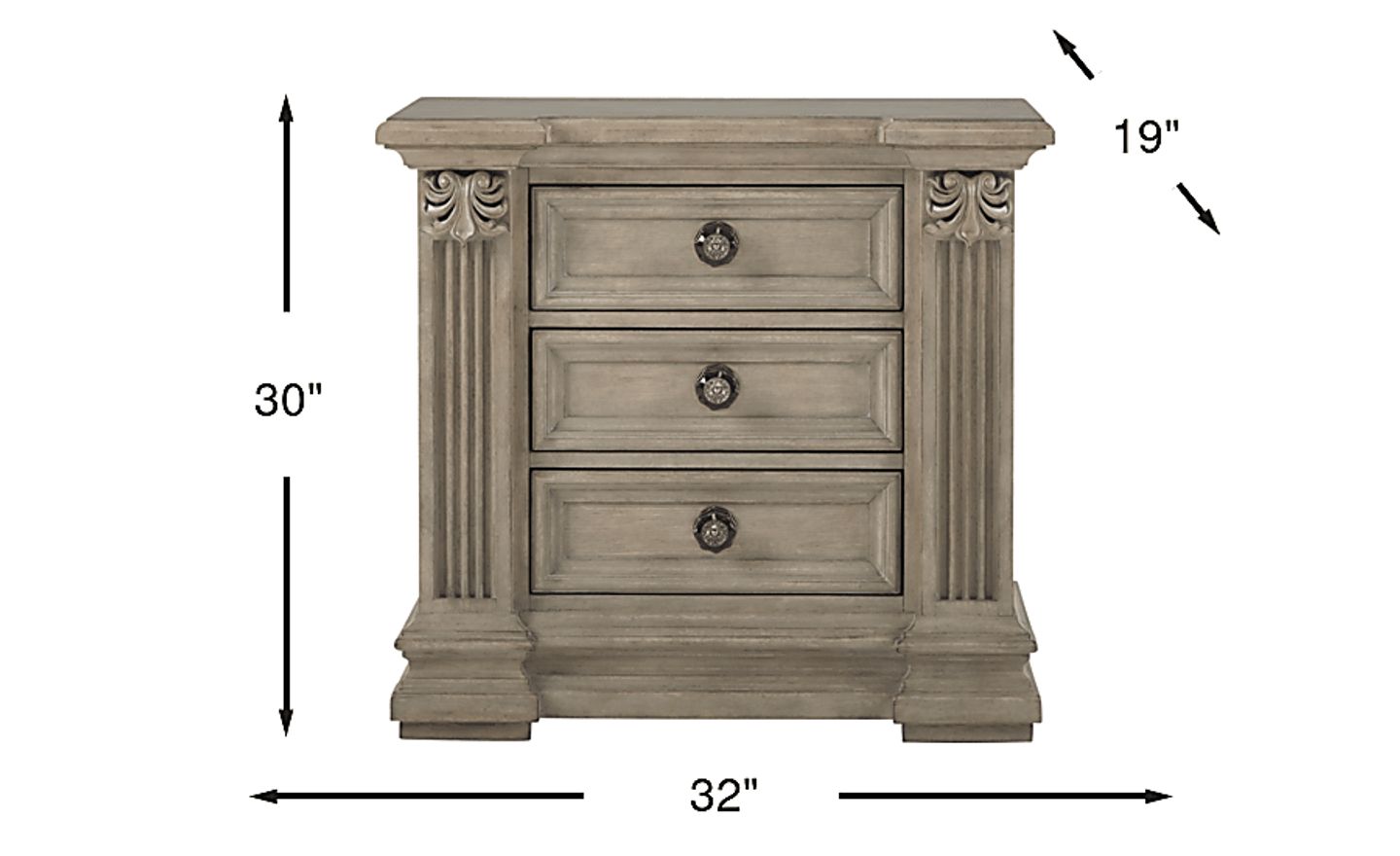 With the Havencrest nightstand at your bedside, you'll always have a place to store things within easy reach. Three drawers feature elegant smoky acrylic hardware with satin nickel metal accents and French and English dovetail drawer joints with kenlin drawer glides for stability. Fluted pilasters on the side are topped with leaf overlays, adding to the classic European style.