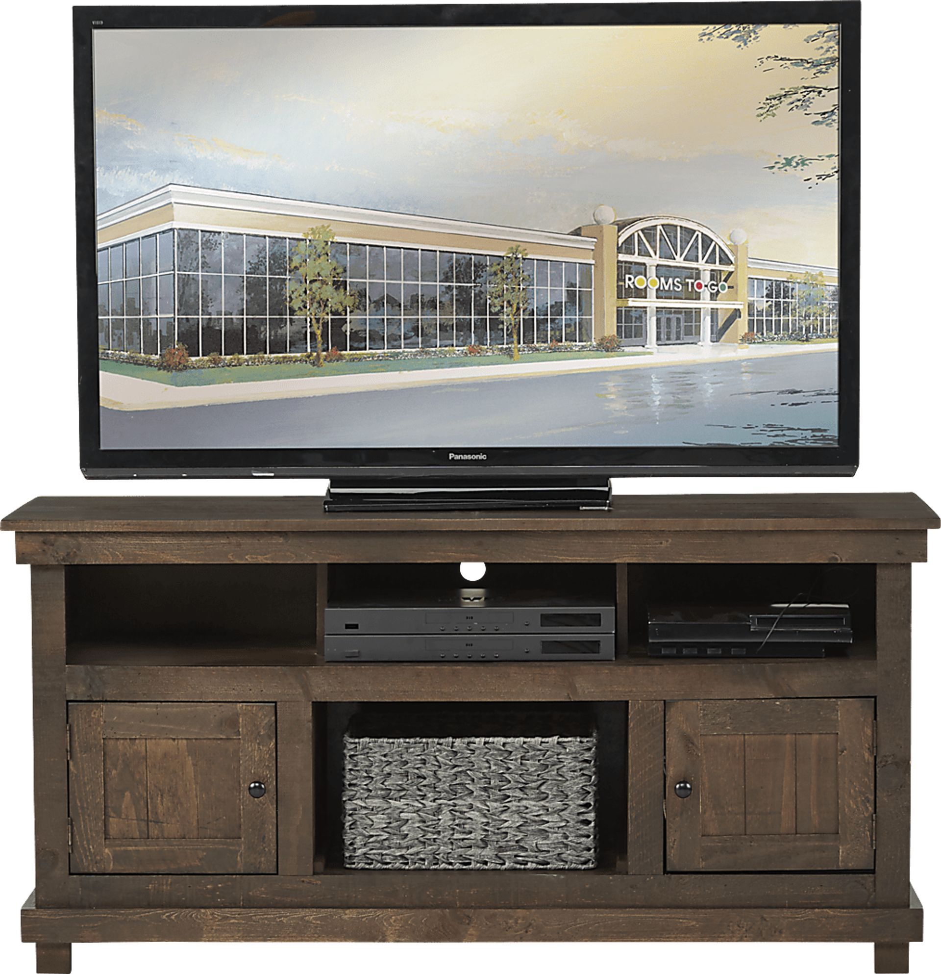 The Havenwood console brings organization to your media space. Three open cubbies and one larger, lower one, are great for storing movie or gaming consoles; a cut out in the back allows easy access to wall plugs. Two doors are great for additional electronic components. Constructed with pine solids and veneers in a decorator-friendly brown finish, it has plenty of matching and coordinating pieces in its collection to mix and match in your home.