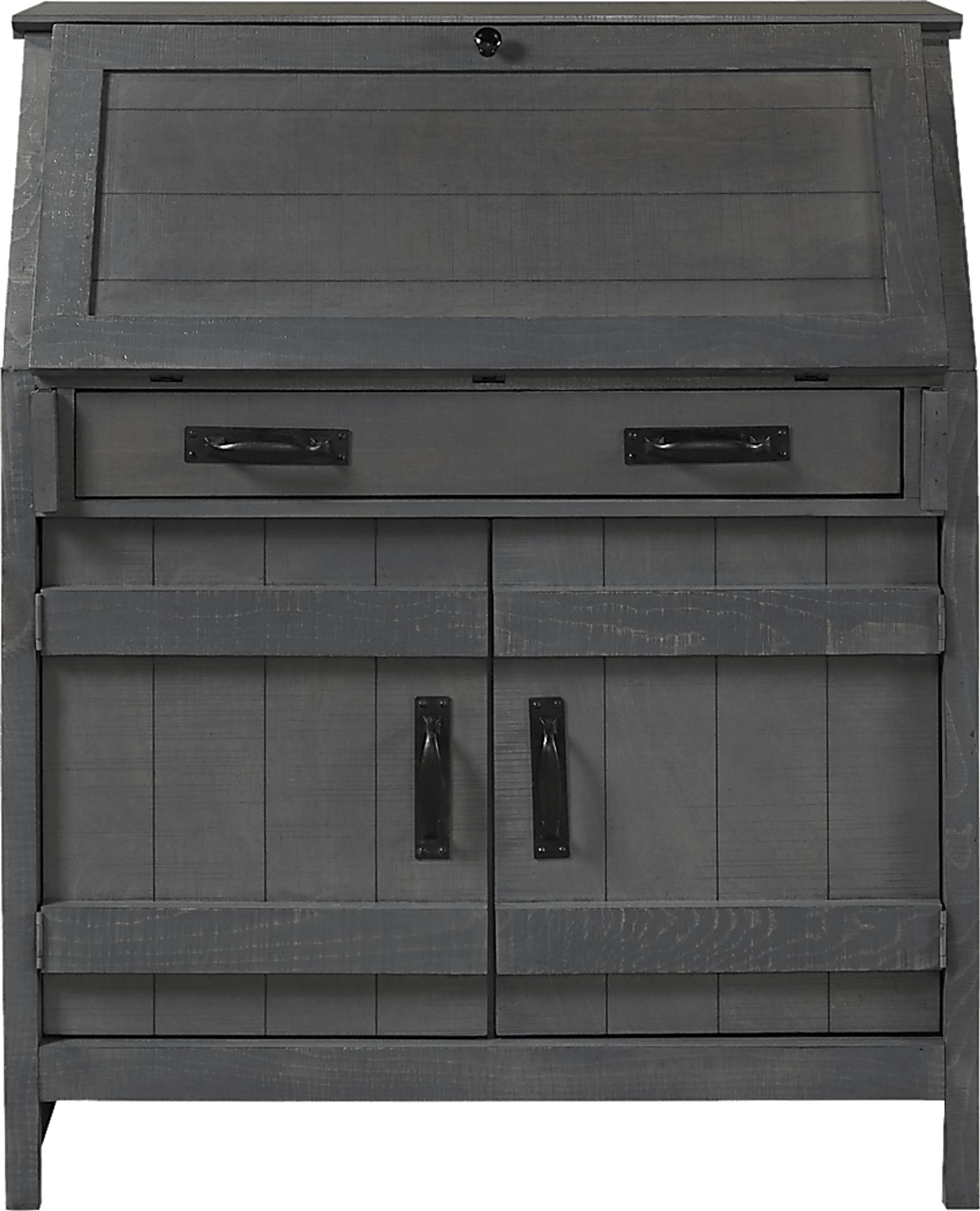 Imparting a bold rustic look, the Havenwood desk sets the tone for a handy home office. Constructed with pine solids and veneers, this piece boasts a distressed gray finish with wood plank styling. A drop lid unfolds to reveal the desk surface, which can be conveniently closed again for privacy or to save space. Underneath, a drawer and two cabinet doors offer additional storage. Compartments located in the hutch make it easy to stay organized, while a power strip containing two outlets and two USB ports charges your devices. For industrial-inspired style, hardware features a gleaming gunmetal finish.