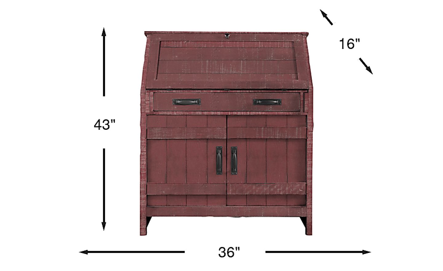 Imparting a bold rustic look, the Havenwood desk sets the tone for a handy home office. Constructed with pine solids and veneers, this piece boasts a distressed red finish with wood plank styling. A drop lid unfolds to reveal the desk surface, which can be conveniently closed again for privacy or to save space. Underneath, a drawer and two cabinet doors offer additional storage. Compartments located in the hutch make it easy to stay organized, while a power strip containing two outlets and two USB ports charges your devices. For industrial-inspired style, hardware features a gleaming gunmetal finish.