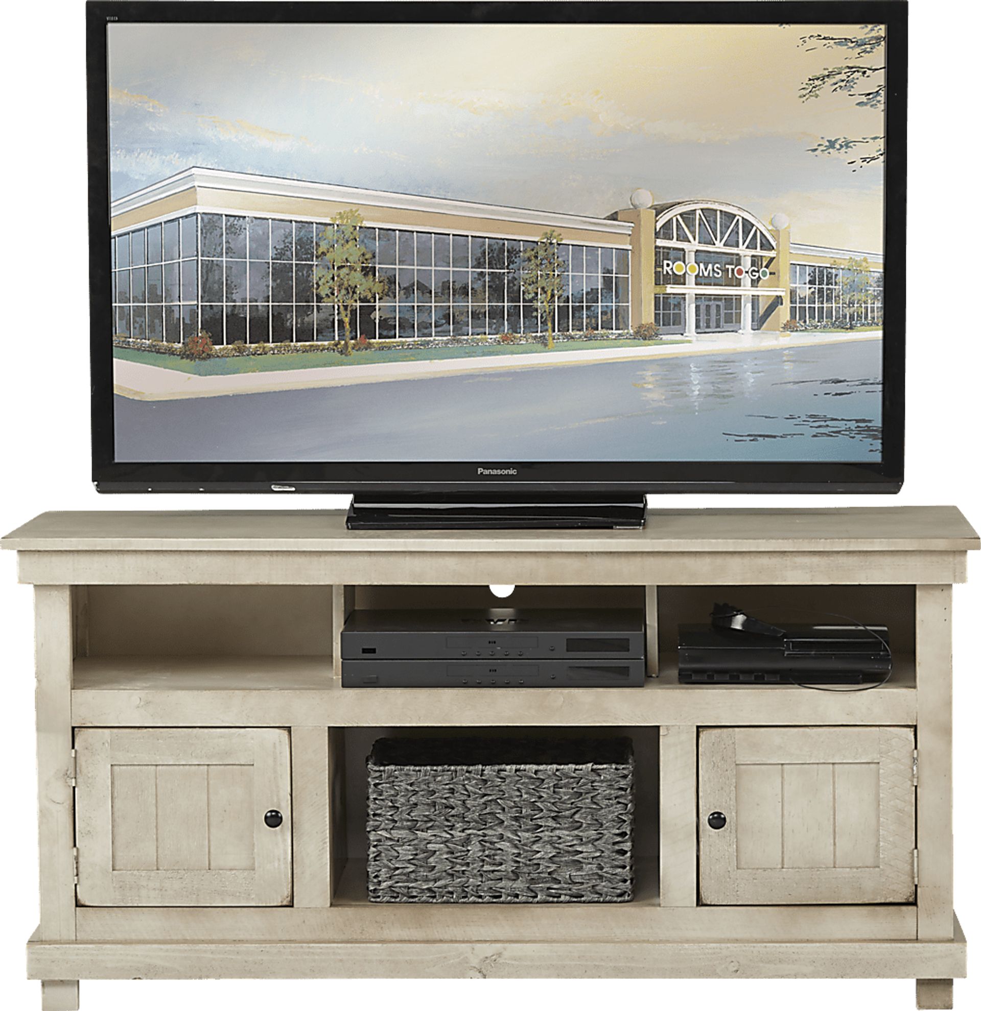 The Havenwood console brings organization to your media space. Three open cubbies and one larger, lower one, are great for storing movie or gaming consoles; a cut out in the back allows easy access to wall plugs. Two doors are great for additional electronic components. Constructed with pine solids and veneers in a decorator-friendly white finish, it has plenty of matching and coordinating pieces in its collection to mix and match in your home.