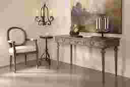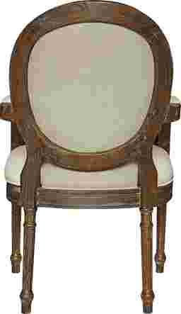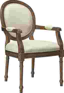 Hand carved details, fluted legs and the mid brown wash finish give this Hawkhorn accent chair a timeless appeal. Natural beige fabric cover the raised seat, oval back and padded arm rest. Customer assembly is required.