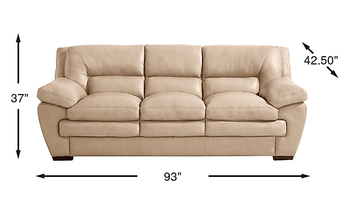 The Hayworth Beige Leather Sofa comfortably seats three people. Its dimensions are 93 inches wide, 42.50 inches deep, and 37 inches high. While it offers generous seating, it's essential to measure your living space, including doorways and hallways, to ensure a comfortable fit. For smaller apartments, while this is a full-sized sofa, its tailored design can integrate well into various layouts, but always verify dimensions for optimal placement.