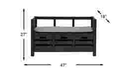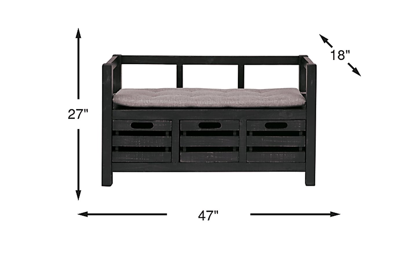 Offering both seating and storage, the Hazel Peak accent bench calls upon a versatile style that's perfect for gathering areas and mudrooms alike. Crafted of pine solids and veneers, this bench features a distressed black finish for a rustic-inspired look. Three drawers host an industrial crate design, providing stylish storage space. Upholstered with gray polyester fabric, a tufted seat cushion includes ties to keep it securely in place.
