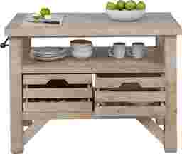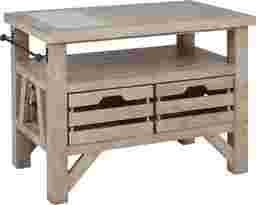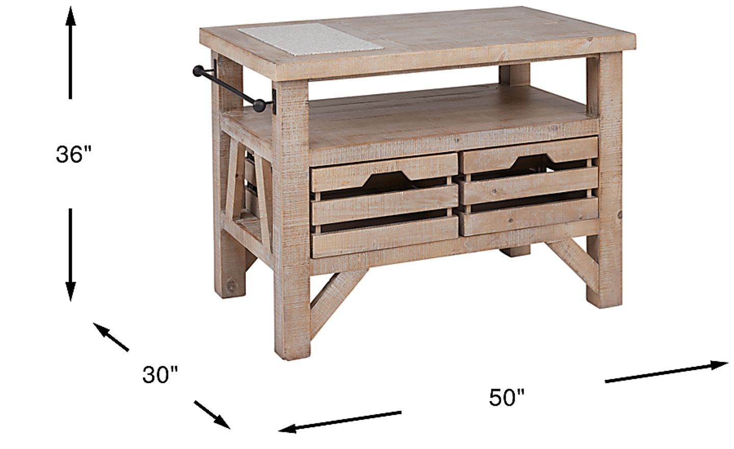 Industrial chic with a rustic edge, the Hazel Peak kitchen island instantly propels your dining area to an on-trend space that you and your guests will adore. Crafted of pine solids and veneers in a distressed champagne finish, this piece is perfect for enjoying spontaneous appetizers. The kitchen island features two crate-style drawers and a lower shelf, along with a towel bar to hang oven mitts and household items. A light wash top panel provides bold contrast that adds visual intrigue to the piece.