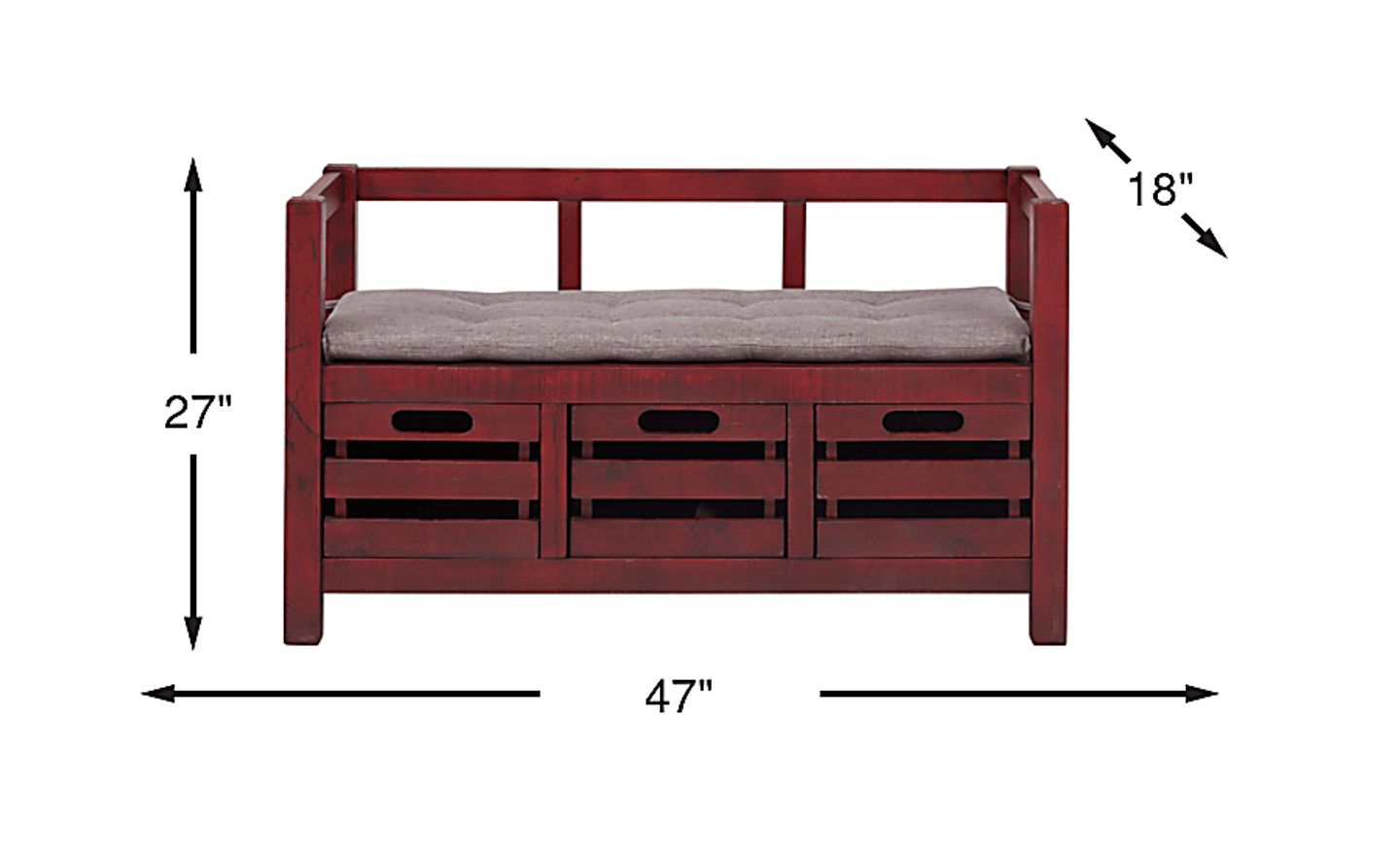 Offering both seating and storage, the Hazel Peak accent bench calls upon a versatile style that's perfect for gathering areas and mudrooms alike. Crafted of pine solids and veneers, this bench features a distressed red finish for a rustic-inspired look. Three drawers host an industrial crate design, providing stylish storage space. Upholstered with gray polyester fabric, a tufted seat cushion includes ties to keep it securely in place.