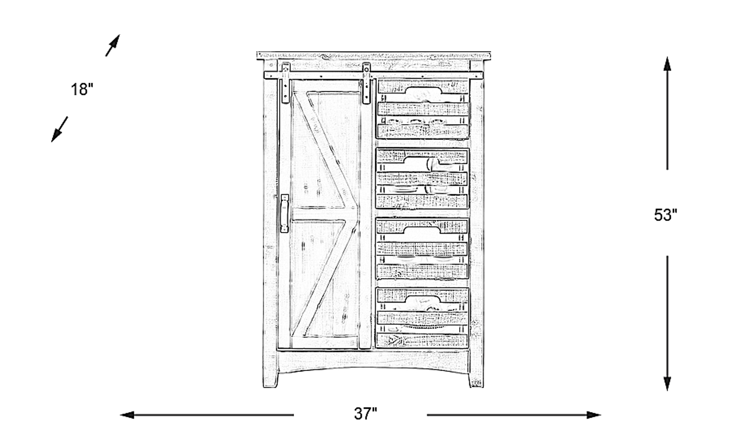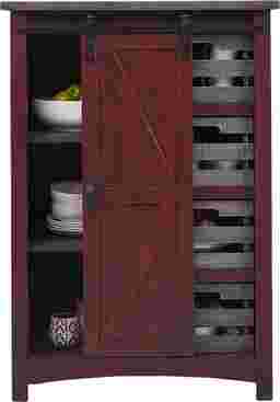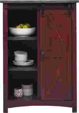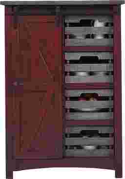 Drawing inspiration from farmhouse, industrial and rustic styles, the Hazel Peak accent cabinet hosts a versatile look that never goes out of fashion. Crafted of pine solids and veneers in a distressed red finish, it features country-chic wood paneling and black metal hardware. This cabinet includes four crate-style drawers, two shelves and a full-length sliding door.