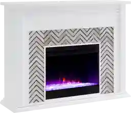 Add the hint of color your lifestyle craves with this Hazelhurst I electric fireplace mantel. Classic two-tone hues contrast in real marble, crafting a zigzag pattern against a fresh white mantel. Shimmering faux crystal adds ambiance with flickering LED flames, alternating colors, and lifelike embers, all controlled from the convenience of your sofa. Enhance the atmosphere of your home when you upgrade your living room or open concept living space with this tiled electric fireplace. Customer assembly is required.