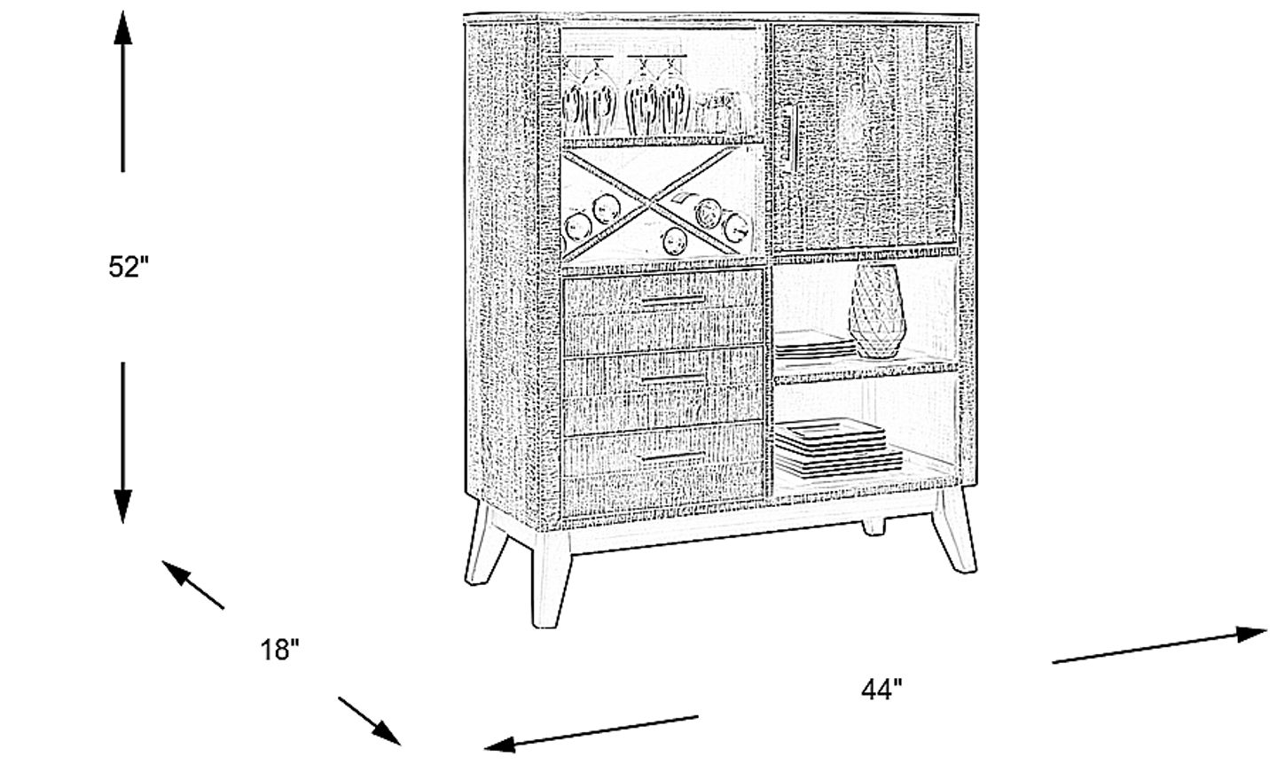 A versatile and attractive addition to any dining space, the Hazelnut Lodge cabinet offers an abundance of storage with a cool contemporary look. Featuring a cabinet, open shelving, three drawers and a built-in wine rack, this modern cabinet is crafted of pine solids and veneers in a chic wheat finish. Contrasting dark tapered legs complete the contemporary cool styling.
