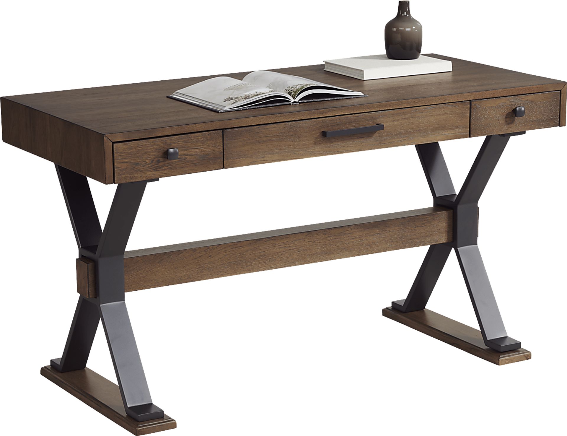 The Hazelnut Woods desk is perfect for adding a touch of rustic-industrial style of your space. The top is crafted with hickory veneers in a brown finish with wood grain detailing over a base that features a double pedestal design with crossed metal accents. Three drawers provide plenty of room to store your belongings while two electrical outlets and two USB ports provide plenty of options for charging your devices.