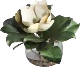 This arrangement is designed with high-quality silk that replicates the delicate, velvety texture of a fresh magnolia bloom. To enhance its authenticity, it is set in an asymmetrical glass vase featuring natural stones and "faux water"—a clear resin that mimics the look of a freshly watered bouquet without the maintenance or mess of real water.