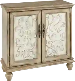 The Hazzen 2-door cabinet offers a perfect blend of functionality and style for your home decor. This accent chest features a floral design on the cream-hued door panels that adds an elegant touch to the design. The natural-hued frame and legs complement the doors, creating a rich contrasting farmhouse look. With a single shelf to help organize your essentials, this 2-door cabinet brings a rustic charm and additional storage to your living space. Customer assembly is required.