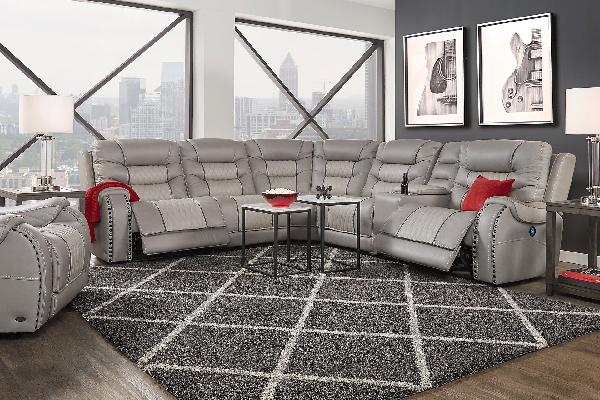 Created to fit your lifestyle and make the most of your family time, the Headliner sectional is all about relaxation, comfort and convenience. This contemporary sectional is packed with premium features and upholstered in gray top grain leather where the body touches. Recliners on each end of the sectional boast USB ports and head-to-toe dual power customized comfort provided by touch-of-a button power adjustable headrests and power reclining chaise style footrests. Additional seating includes a stationary chair and standard recliner. A console with lift-top storage features two cupholders. Stylish too, the sectional has contrasting stitching detail, nailhead accents and diamond stitched seating insets. Combined, these ingredients create the perfect headquarters for watching the big game and more. 23" extension when footrest is fully reclined. Allow 6" for wall spacing. Top Grain Leather Where the Body Touches and Polyurethane Fabric sides and backs.