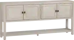 The Heartgate beige console table blends natural charm with modern functionality, featuring a rectangular shape and a warm, neutral finish. The two front doors showcase a beautifully crafted panel design, accented by Venetian bronze rectangular pulls. Magnetic closures and European hinges ensure smooth operation. Two compartments provide concealed storage, while an open fixed shelf enhances display options. Two cord management holes add versatility, and no assembly is required.