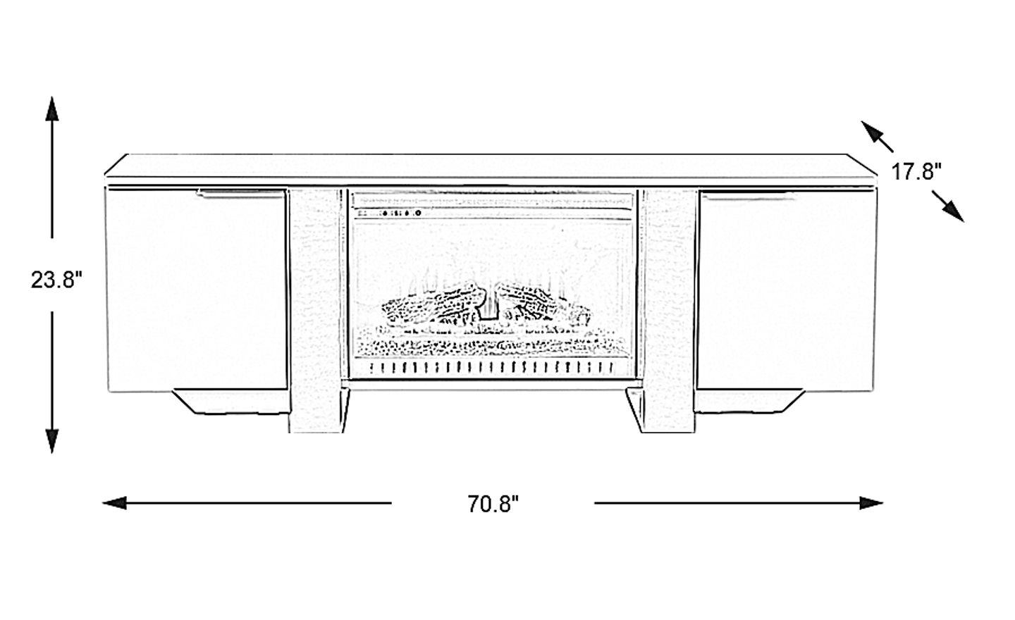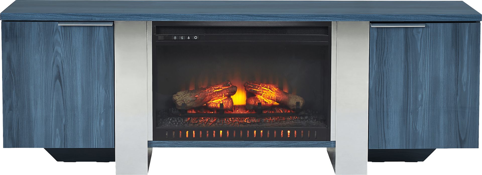 Contemporary with a hint of extravagance, the Heatherview console with electric log fireplace offers an astonishing amount of storage for your media essentials. Crafted in a lacquered blue finish, this console has room for a 70-inch television. Each end of the console features storage hidden behind doors that open to reveal internal cubbies configured with top and bottom shelves. Chrome metal hardware frames the electric fireplace that features innovative flame effects on bricks and logs for added depth and 3D realism. A convenient remote controls glow levels and includes a built-in timer and adjustable thermostat. The fireplace can heat up to 1000 square feet of space or be operated without heat. When not in use, the fireplace can be removed for additional console storage.