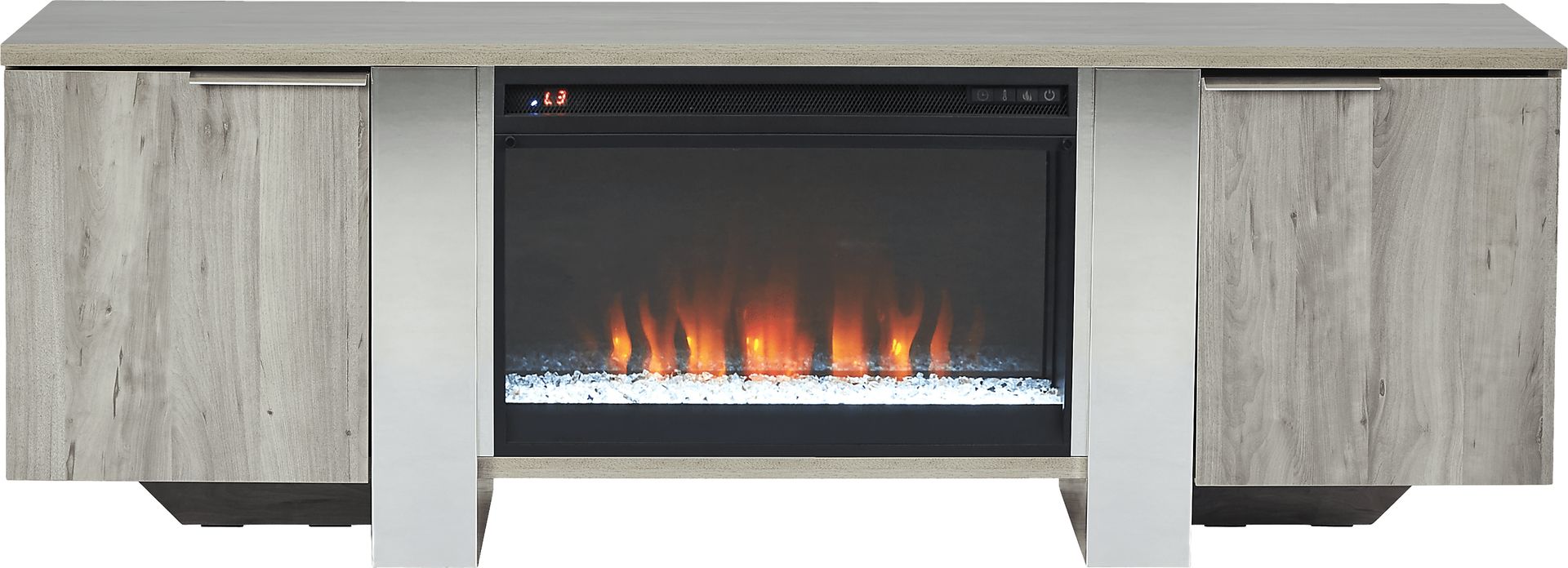 Contemporary with a hint of extravagance, the Heatherview console with electric fireplace offers an astonishing amount of storage for your media essentials. Crafted in a lacquered gray finish, this console has room for a 70-inch television. Each end of the console features storage hidden behind doors that open to reveal internal cubbies configured with top and bottom shelves. Chrome metal hardware frames the electric fireplace that features ambient lighting with four color changing options across a gorgeous display of LED lights. A convenient remote controls glow levels and includes a built-in timer and adjustable thermostat. The fireplace can heat up to 400 square feet of space or be operated without heat. When not in use, the fireplace can be removed for additional console storage.