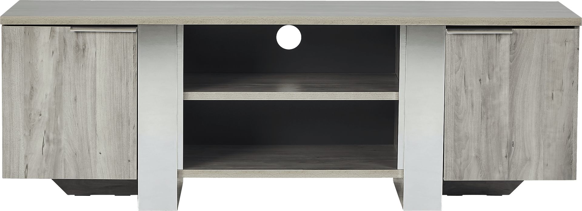 Contemporary with a hint of extravagance, the Heatherview console offers an astonishing amount of storage for your media essentials. Crafted in a lacquered gray finish, this console has room for a 70-inch television. Accenting chrome hardware frames two auxiliary storage shelves in the center of the console with rear wiring pass through holes to ensure your media components have a designated storage spot. Each end of the console features additional storage hidden behind doors that open to reveal internal cubbies configured with top and bottom shelves.
