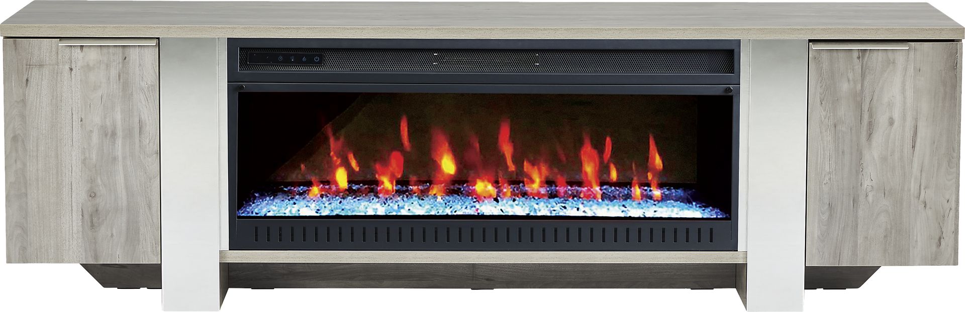 Contemporary with a hint of extravagance, the Heatherview console with electric fireplace offers an astonishing amount of storage for your media essentials. Crafted in a lacquered gray finish, this console has room for a 79-inch television. Each end of the console features storage hidden behind doors that open to reveal internal cubbies configured with top and bottom shelves. Chrome metal hardware frames the electric fireplace that features ambient lighting with four color changing options across a gorgeous display of LED lights. A convenient remote controls glow levels and includes a built-in timer and adjustable thermostat. The fireplace can heat up to 400 square feet of space or be operated without heat. When not in use, the fireplace can be removed for additional console storage.
