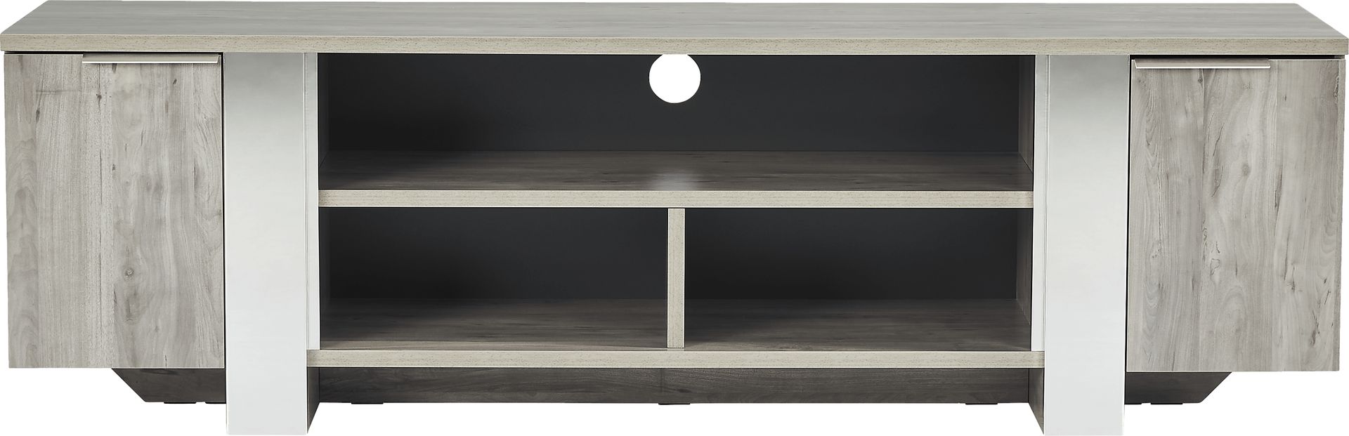Contemporary with a hint of extravagance, the Heatherview console offers an astonishing amount of storage for your media essentials. Crafted in a lacquered gray finish, this console has room for a 79-inch television. Accenting chrome hardware frames two auxiliary storage shelves in the center of the console with rear wiring pass through holes to ensure your media components have a designated storage spot. Each end of the console features additional storage hidden behind doors that open to reveal internal cubbies configured with top and bottom shelves.