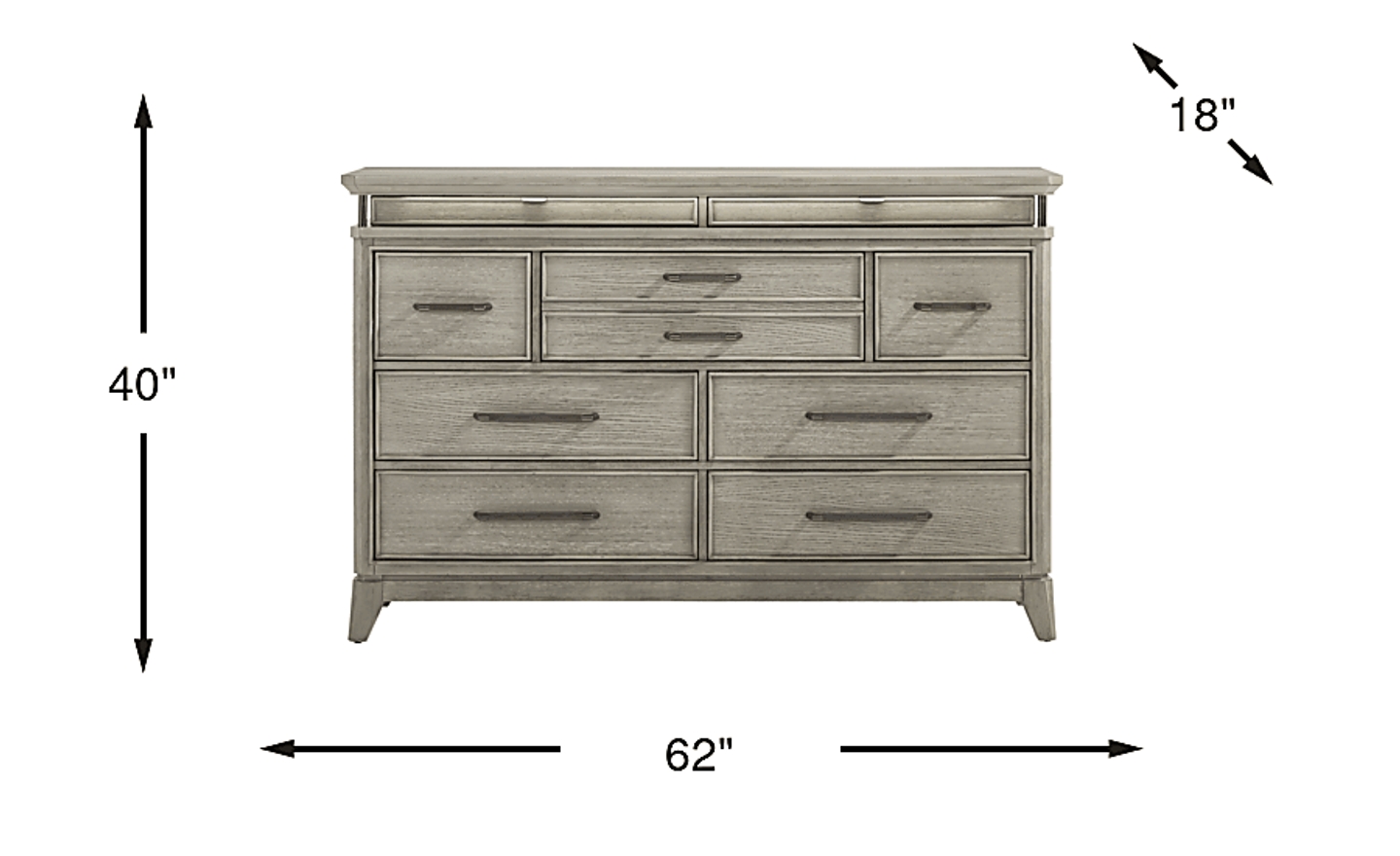 Quietly radiant with the soft serenity of promise for each new day, the Heiress collection's understated confidence invites you into a world alive with possibilities. The dramatically recessed top drawers of this dresser are outlined by brilliant touch-activated LED lights. The gray finish coordinates with the unique textured metal hardware and metal corner details. Chamfered edges and tapered feet create a distinguished look.