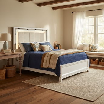 Quietly radiant with the soft serenity of promise for each new day, the Heiress collection's understated confidence invites you into a world alive with possibilities. The sophisticated upholstered headboard of this bed features thick padded panels in beige framed with a deep channel detail. Outlining the soft centerpiece is a brilliant halo of touch-activated LED lights. The panel footboard in a white finish features chamfered edges and tapered feet for a distinguished look. Mattress and foundation (if required) sold separately.