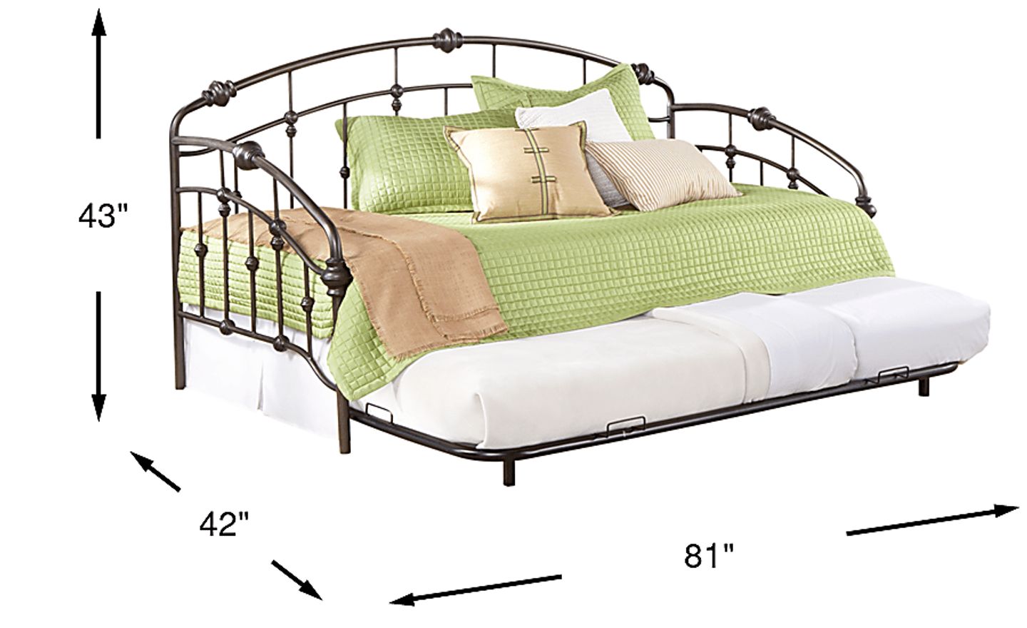 Offering classic styling the Heirloom Park daybed makes a versatile addition to any room. Space saving too, this daybed includes a pull out trundle that doubles the sleeping space (mattress not included; accommodates an 8" mattress only). The back and sides of this stylish piece feature subtle curves and shaped castings for further interest. This lovely daybed comes in a durable powder coated pewter finish. Mattress not included.