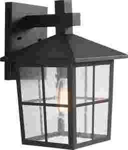 Welcome your friends and family home in the warm light of the classic outdoor Heiry Park sconce. With its traditional lantern profile, black finish, and clear seeded glass shade, this sconce is the perfect entryway accent. Flank either side of a doorway to welcome your guests to your home, line your front and back porch to illuminate a small evening chat outside, or install along a wall to light your path without fear of stumbling in the dark. Professional installation by an electrician is recommended.