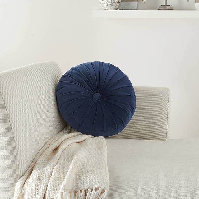 This Collection of throw pillows brings accessibility to luxury. Velvety soft textures and beaded accents elevate your space with an elegant touch thats positively eye-catching. Indulge in the velvety soft texture of this round throw pillow. Its ruched cotton cover gives your living room or bedroom a beautiful and refined look, crafted in a solid navy color that fits seamlessly in boho-modern styles of decor. Toss this luxurious pillow on your sofa or bed for an instant uplift in elegance, or on the floor with other accent pillows for an extra comfy cushion. 16 diameter.