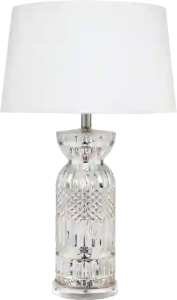 The Herbert Peak lamp is an elegantly patterned contemporary lamp in an antique silver mercury glass with a traditional aesthetic resting on a clear acrylic base. Perfect for a bedroom or living room setting for a classic look. Partial assembly may be required.