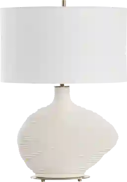 The Hereford Cave White Lamp is crafted with care from high-quality ceramic with a warm white finish, paired with antique brass plated details. The organically shaped silhouette and stacked ring design creates a visual appeal. The oval hardback shade is an off-white linen fabric with natural slubbing. Partial assembly may be required.