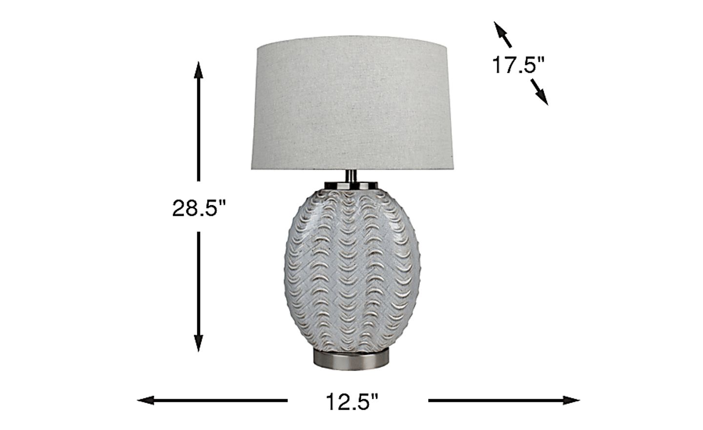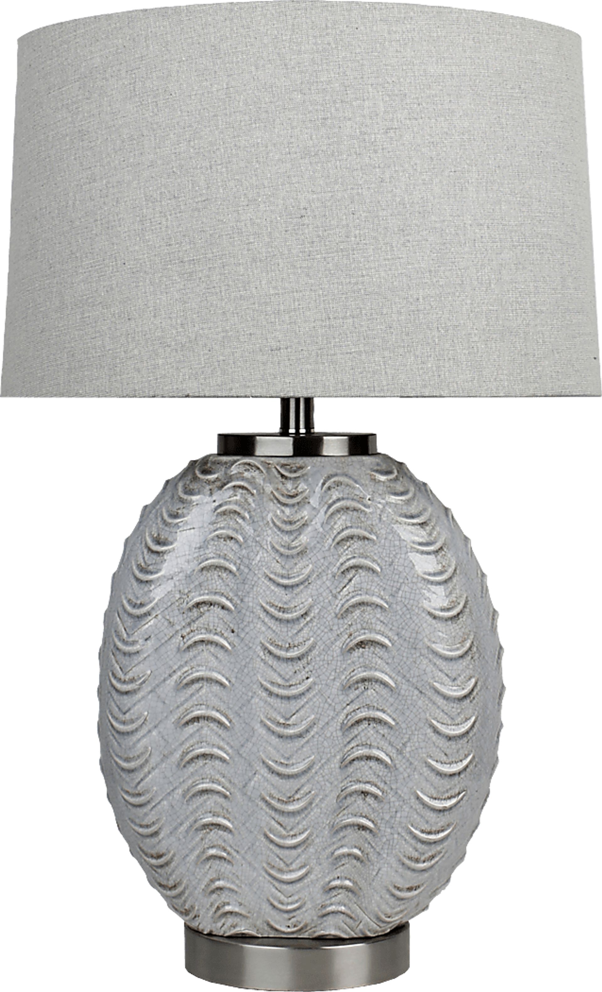 The Hermiston table lamp boasts an elegant style to light up your space. Its brushed silver base features textured moulding that resembles beautiful ocean waves. Topped off with a gray linen shade, its oval shape emphasizes a coastal look. This lamp takes a maximum 150-watt standard bulb and includes a three-way switch.