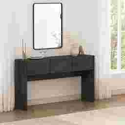 The Herosunny dark gray console table blends clean lines with soft edges for a look that's both minimal and inviting. The subtle wood grain texture adds warmth and depth, while the seamless drawer fronts lend a clean, sculptural presence. Designed with versatility in mind, each piece offers functional storage that fits effortlessly in entryways, bedrooms, or living spaces. Customer assembly is required.