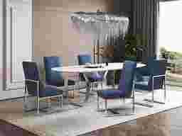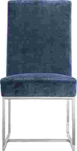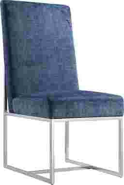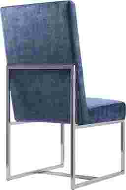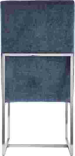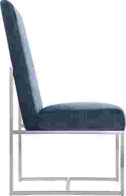 Carefully calibrated. Ultra-fresh and contemporary, the Herrli blue side chair boasts of perfection. All polished chrome and precise geometric angles, the open metal frame hints at industrial chic, while the slender silhouette of its luxurious velvet high-back seat rests lightly against it. The overall effect expresses a powerful sense of balance that will revitalize the look of any dining space.