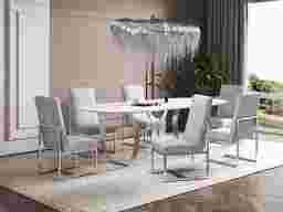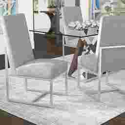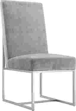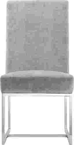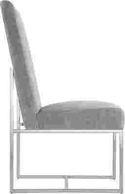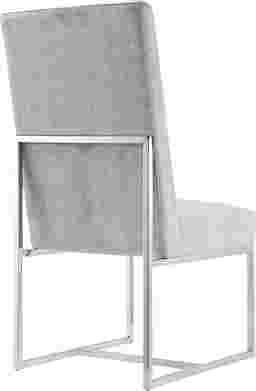 Carefully calibrated. Ultra-fresh and contemporary, the Herrli light gray side chair boasts of perfection. All polished chrome and precise geometric angles, the open metal frame hints at industrial chic, while the slender silhouette of its luxurious velvet high-back seat rests lightly against it. The overall effect expresses a powerful sense of balance that will revitalize the look of any dining space.
