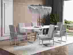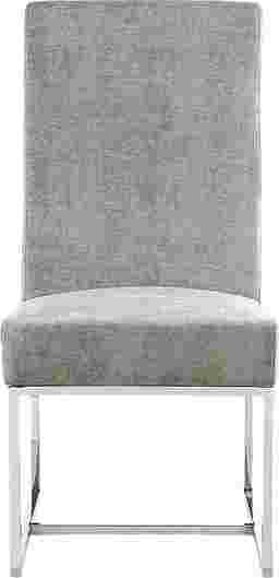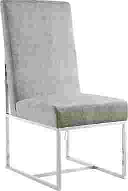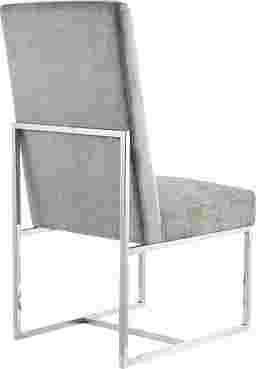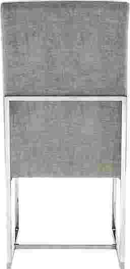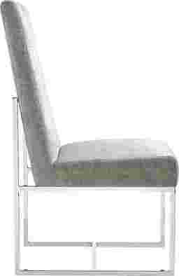 Carefully calibrated. Ultra-fresh and contemporary, the Herrli steel gray side chair boasts of perfection. All polished chrome and precise geometric angles, the open metal frame hints at industrial chic, while the slender silhouette of its luxurious velvet high-back seat rests lightly against it. The overall effect expresses a powerful sense of balance that will revitalize the look of any dining space.