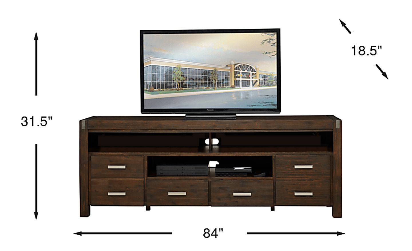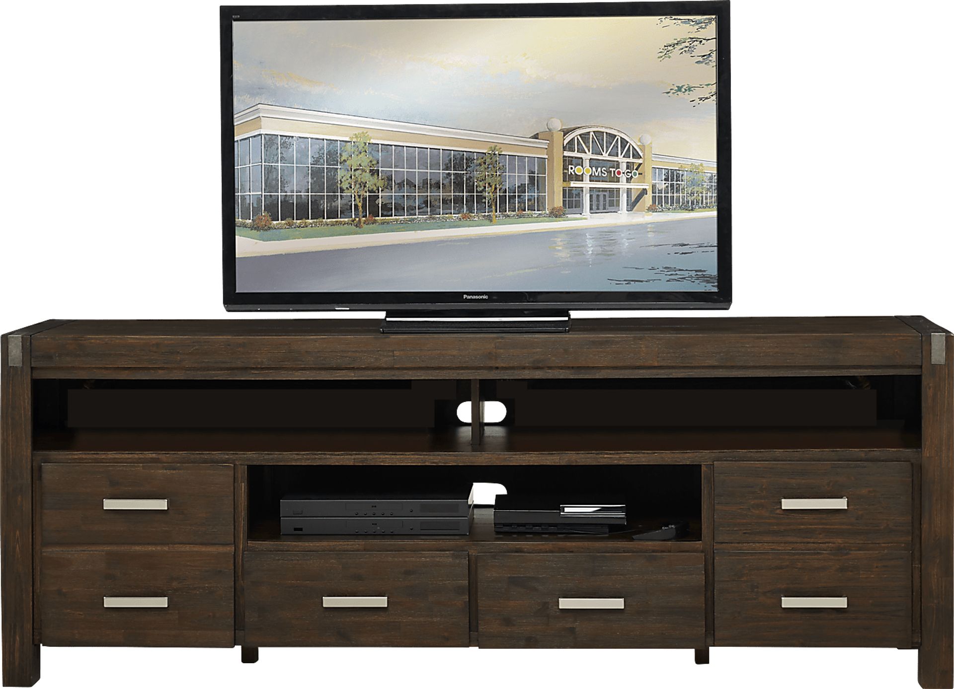 Offering the perfect place for your flat screen TV, the Hidden Springs console is a wonderful addition to your home. Crafted from acacia solids and veneers, the brushed espresso finish is complemented with nickel drawer pulls. Two open middle compartments each have a pass through hole in the back that helps keep wires organized, while providing a great place for electronic components or gaming systems. Two doors and two drawers provide plenty of room for storing additional media.