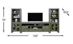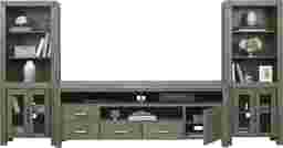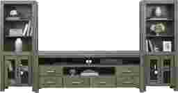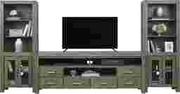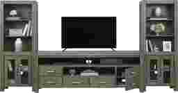 Offering the perfect place for your flat screen TV and more, the Hidden Springs II console is a wonderful addition to your home. Crafted from acacia solids and veneers, the brushed gray finish is complemented with nickel finished hardware. Two open middle compartments each have a pass-through hole in the back that helps keep wires organized, while providing a great place for electronic components or gaming systems. Two doors and two drawers provide plenty of room for storing additional media. Side piers complete the unit with more shelves for display and storage.