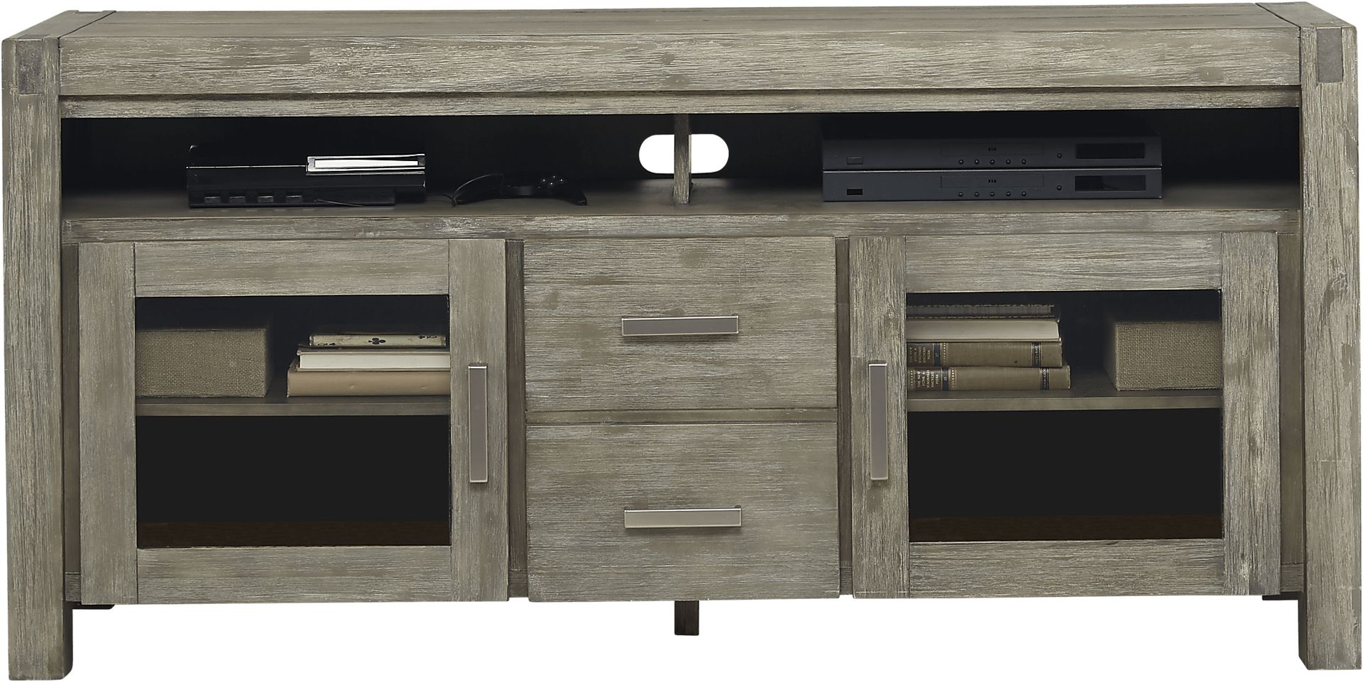 Offering the perfect place for your flat screen TV, the Hidden Springs console is a wonderful addition to your home. Crafted from acacia solids and veneers, the brushed gray finish is complemented with nickel drawer pulls. Two doors feature glass fronts, while an open cubby and additional solid door cabinet provide plenty of room for electronic components or gaming systems with adjustable shelving for maximum flexibility.