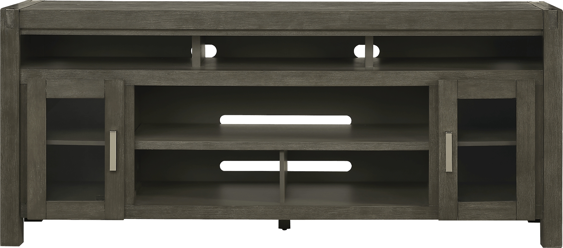 Offering the perfect entertainment hub for a lively living room, the Hidden Springs console is a wonderful addition to your home. Crafted from acacia solids and veneers, the gray finish is complemented with nickel drawer pulls. Three open middle compartments have passthrough holes in the back that help keep wires organized, while providing a great place for electronic components or gaming systems. Two glass door cabinets provide plenty of room for storing additional media or displaying items.