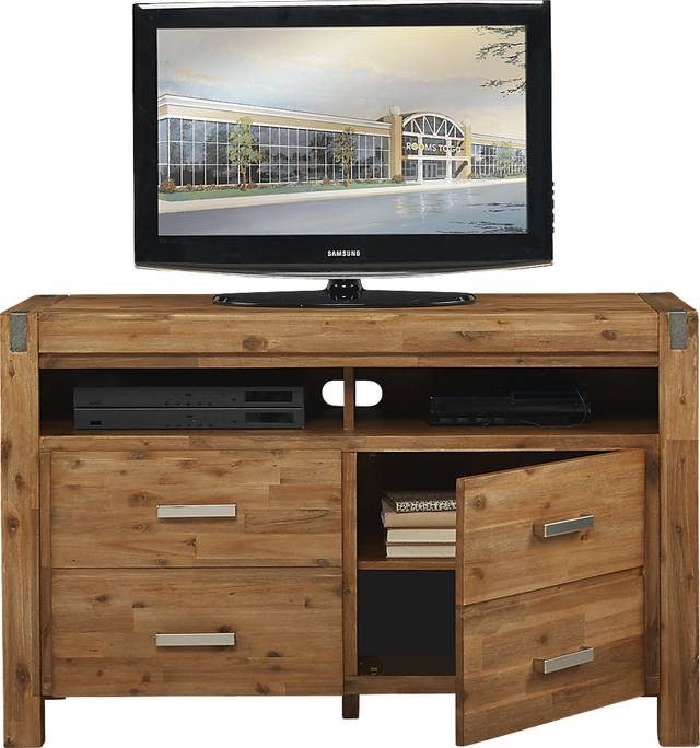 Offering the perfect place for your flat screen TV, the Hidden Springs II console is a wonderful addition to your home. Crafted from acacia solids and veneers, the brushed tan finish is complemented with nickel drawer pulls. Two open compartments with one pass through hole in the back help keep wires organized, while providing a great place for electronic components or gaming systems. Two closed door lower cabinets each contain an adjustable shelf, offering plenty of additional hidden storage.