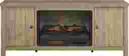 Effortlessly stylish and thoughtfully designed, the High Mountain collection makes it easy to stay organized and fully immersed in your home entertainment space. This contemporary console features a natural finish and a handsome square-shaped frame that delivers a timeless, grounded look. Rear wire management holes in the dual cabinets provide a clutter-free setup, while adjustable shelves offer flexible storage to support your organization needs. At the center, a removable log fireplace with flickering flames and faux embers, working with or without heat for a warm ambiance year-round.