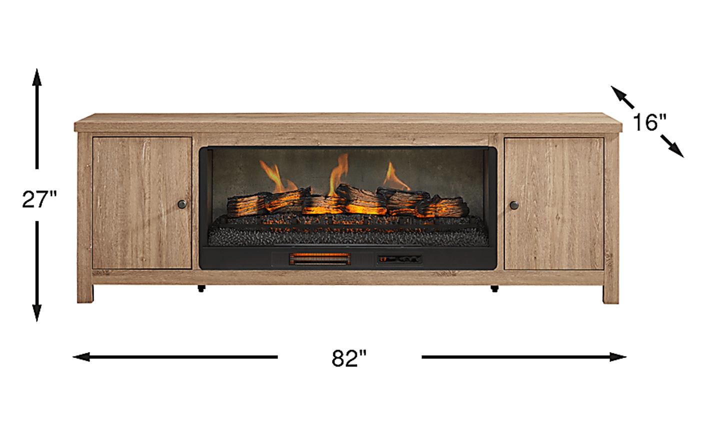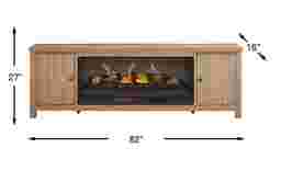 Effortlessly stylish and thoughtfully designed, the High Mountain collection makes it easy to stay organized and fully immersed in your home entertainment space. This contemporary console features a natural finish and a handsome square-shaped frame that delivers a timeless, grounded look. Rear wire management holes in the dual cabinets provide a clutter-free setup, while adjustable shelves offer flexible storage to support your organization needs. At the center, a removable log fireplace with flickering flames and faux embers, working with or without heat for a warm ambiance year-round.