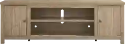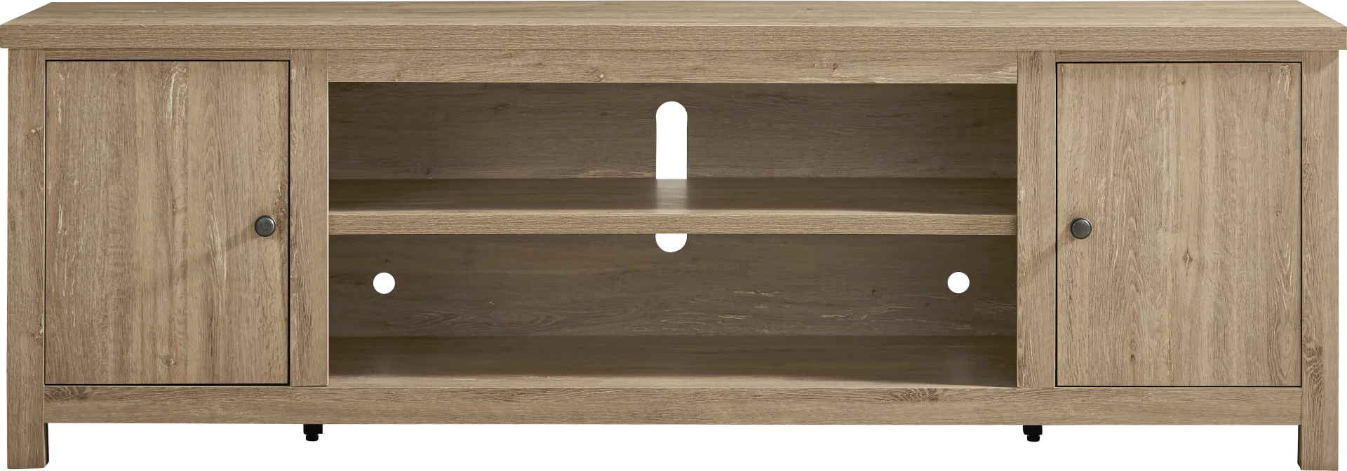 Effortlessly stylish and thoughtfully designed, the High Mountain collection makes it easy to stay organized and fully immersed in your home entertainment space. This contemporary console features a natural finish and a handsome square-shaped frame that delivers a timeless, grounded look. Rear wire management holes in the dual cabinets provide a clutter-free setup, while adjustable shelves offer flexible storage to support your organization needs. At the center, an open shelf provides plenty of display space for your entertainment essentials.