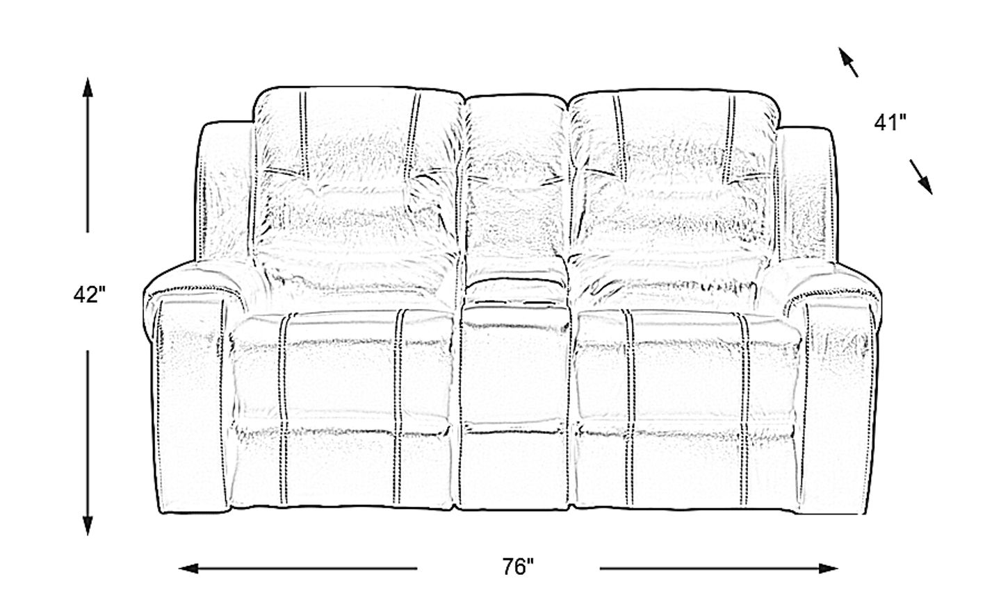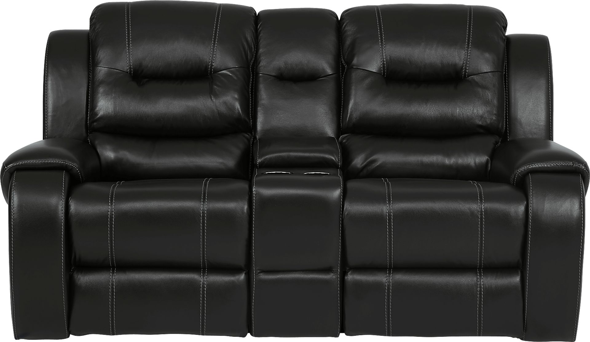 Cozy up and recline in the sleek and soft High Plains loveseat. This practical piece has a lift top storage console with two cupholders ideal for keeping your favorite refreshments close. Its supple black top grain leather upholstery where the body touches offers comfort and luxury, while its manually reclining design lets you stretch out with ease. 25" extension when footrest is fully reclined. Allow 5" for wall spacing. Top grain leather where the body touches and vinyl sides and backs.