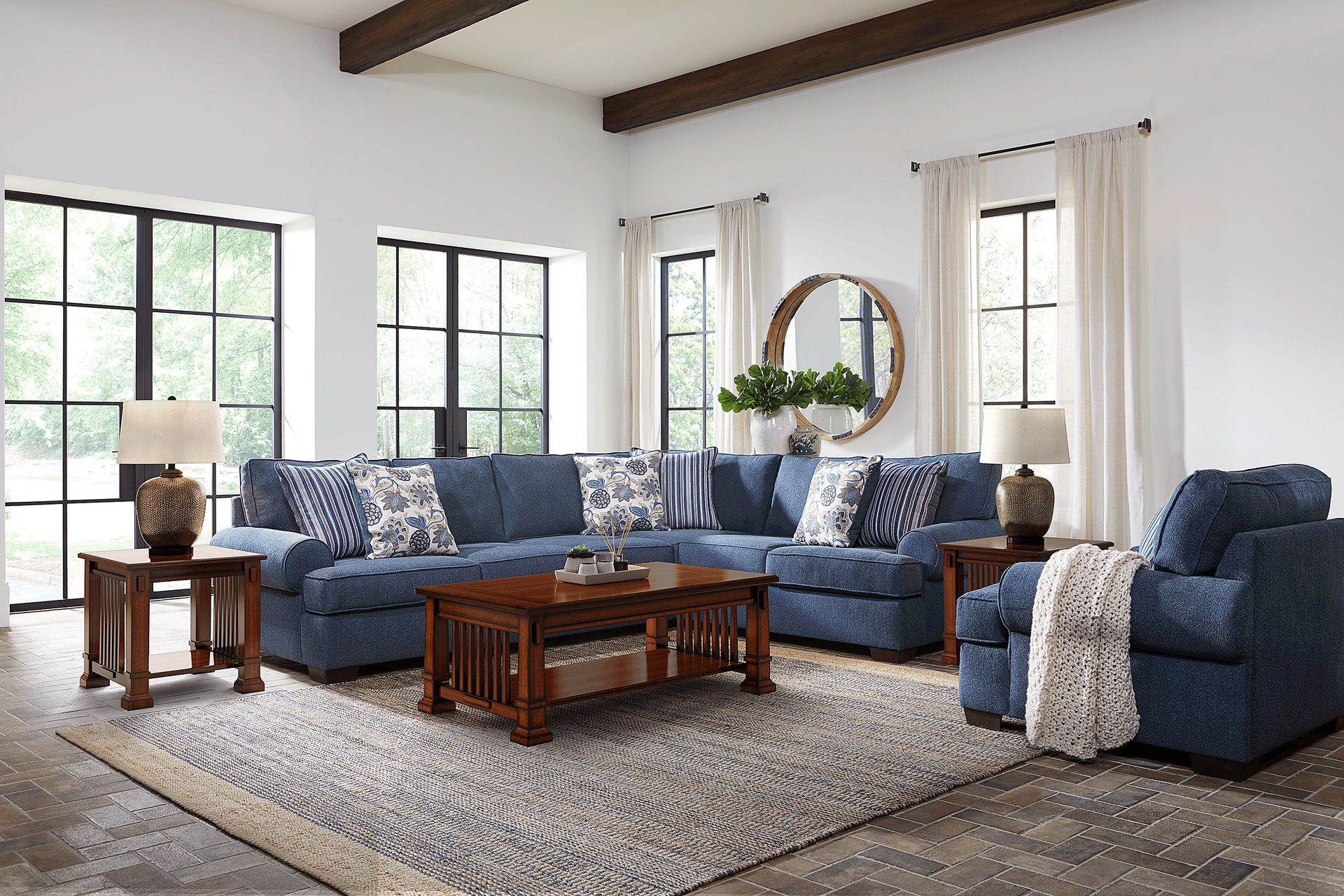 Designed for social gatherings, the Highland Lakes sectional makes a statement with timeless traditional style. Upholstered in soft woven fabric, this sectional comes in a calming blue color that will make family and guests alike feel right at home. Adding charm are classic rolled arms and decorative pillows featuring floral and striped patterns. Reversible seat and back cushions help extend the lifetime of your sectional. 100% Polyester