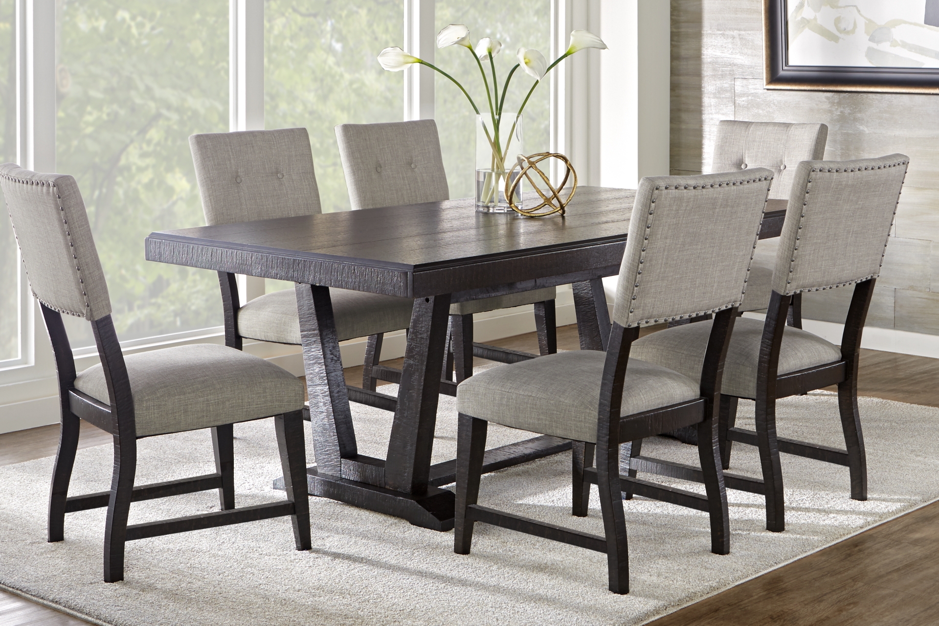 Urban rustic styling and chic tailored touches combine to create the Hill Creek dining room. Crafted with wood solids and oak veneers, the collection has a rubbed black finish. Perfect for gathering family and friends, the 41 x 76 inch table features a plank style top and supportive trestle base. Wonderfully detailed side chairs feature tufted gray linen-style upholstery along with decorative nailhead trim.