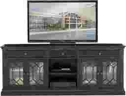 Position your TV on the stylish Hill Town console for a look with tons of polish. The transitional style features attractive fretwork over the glass doors, which open to reveal one removable shelf behind each door. Three drawers are ideal for storing remotes or loose cables, while two open cubbies make a great home for a media player. Made of wood solids and maple veneers, the rubbed through black finish gives it a subtle weathered look.