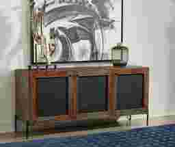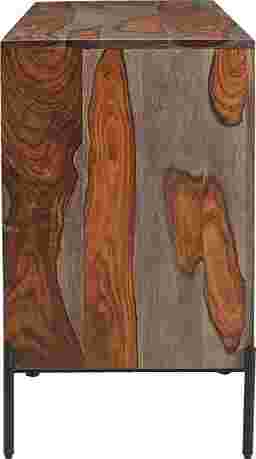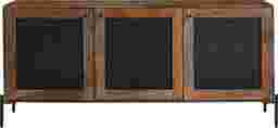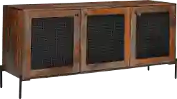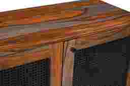This Hillindale Sheesham wood credenza is a multifunctional and stylish piece that can complement any living space. The clean-lined design features intricate cane inlay on each of the three door fronts, highlighting the natural beauty of the wood's grain. Beyond its aesthetic appeal, the credenza provides ample storage options with its dual doors that open up to reveal ample space for storing essentials. This piece is a perfect combination of form and function and can serve as an eye-catching focal point in any room. Customer assembly is required.