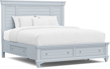 Create your own relaxing escape when you select the cottage style Hilton Head storage bedroom. This delightful collection with a classic panel bed features bead moulding for a coastal-inspired shutter-style aesthetic. Brushed nickel finished hardware provides a compelling contrast to the light blue finish. Drawers built into the footboard provide room for extra linens and blankets. Mattress and foundation (if required) sold separately.