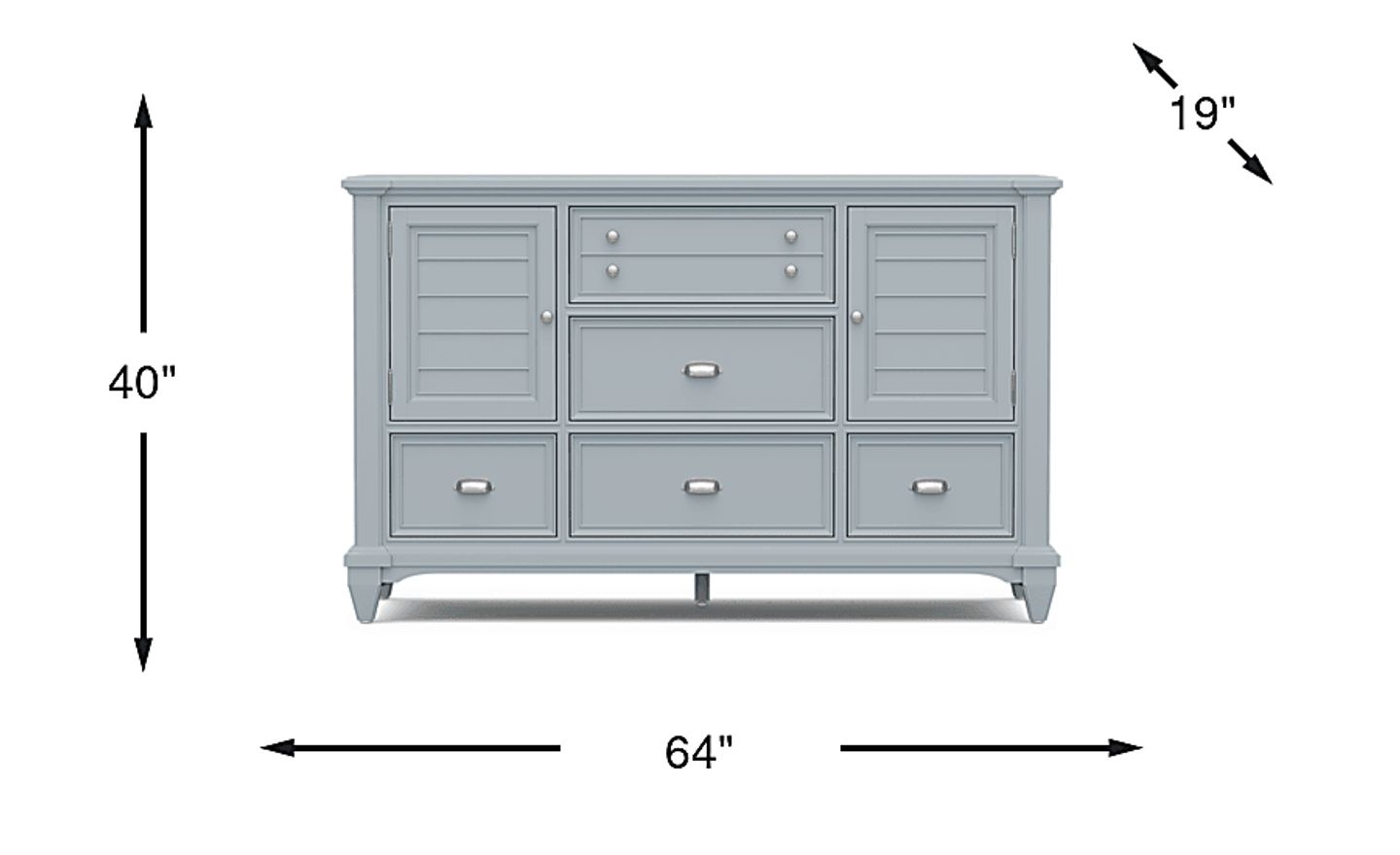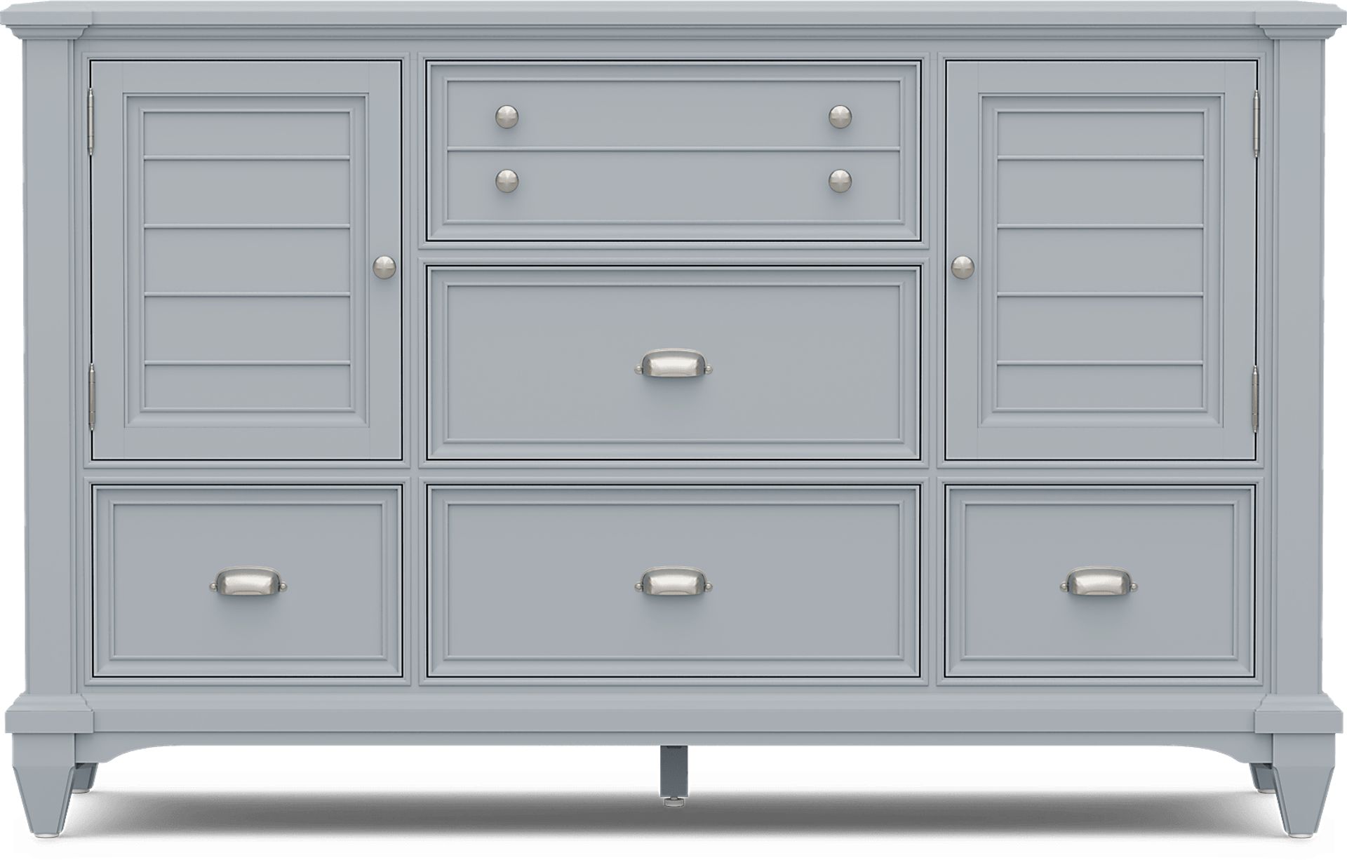 Simple yet tasteful cottage styling is the hallmark of the Hilton Head dresser. Boasting a fresh light blue finish, this piece has five spacious drawers for storage (the drawer on the top is one drawer made to look like two). All drawers are crafted using English and French dovetail construction for strength and stability. Each door has bead moulding for a shutter look and opens to reveal an adjustable shelf for folded clothing. Brushed nickel finished hardware adds the final touch. This is a timeless dresser that will always be in style.